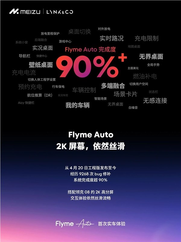 Flyme Auto是魅族专为汽车打造的车机系统,从4月20日工程版发布至今,经历9268次bug修补,系统完成度超90%。