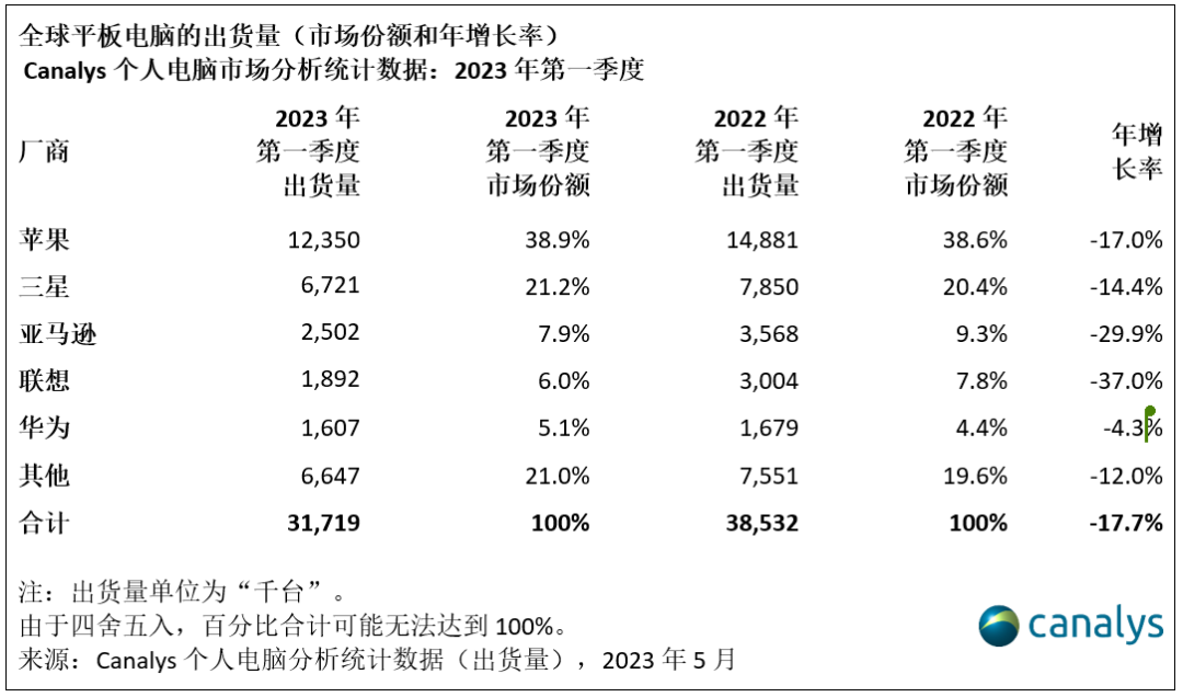 科技市场独立分析机构 Canalys发布了2023年第一季度全球平板电脑出货量情况。数据显示,2023年第一季度全球平板电脑出货量为3170万台,同比下降18%。这是自2020年第一季度新冠疫情爆发以来的最低出货量,当时平板电脑的供应和分销都受到重挫。