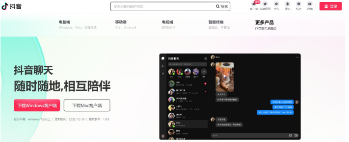 官网显示,“抖音聊天”更新时间为2022年12月30日,最新版本为1.0.0,支持Windows和Mac客户端。