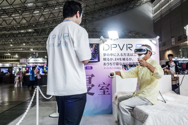 本次TGS 2023,大朋VR以“家”为核心主题,将“家”中的不同场景还原在展会现场:一个带榻榻米垫的日式房间、舒适的卧室、客厅、阳台及书房,每个房间都融入虚拟现实元素配备了大朋E4,重现了家的舒适感,让参展者充分体验在“家”中玩转大朋E4。“床”的出现,让大朋VR展位逐渐火爆全场,这波“躺赢”更是引起众多媒体关注,获得了当地媒体(雅虎)的特别报道。现场众多玩家表示,在游戏展上第 一次看见床的出现,非常好奇躺在床上玩VR是什么样的体验。体验者们佩戴上大朋VR明星产品E4,躺在“卧室床上”观看自己感兴趣的内容,随后可以进入“卧室”、“客厅”“阳台”等,挥动着四肢进行VR游戏体验。