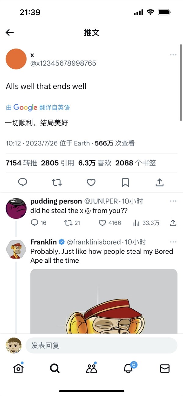 事情仿佛朝着人们期待的那般发展,过了一天之后,推特的官方账号就获得了X”的昵称,而原ID主人则发推文表示一切顺利,结局美好”。