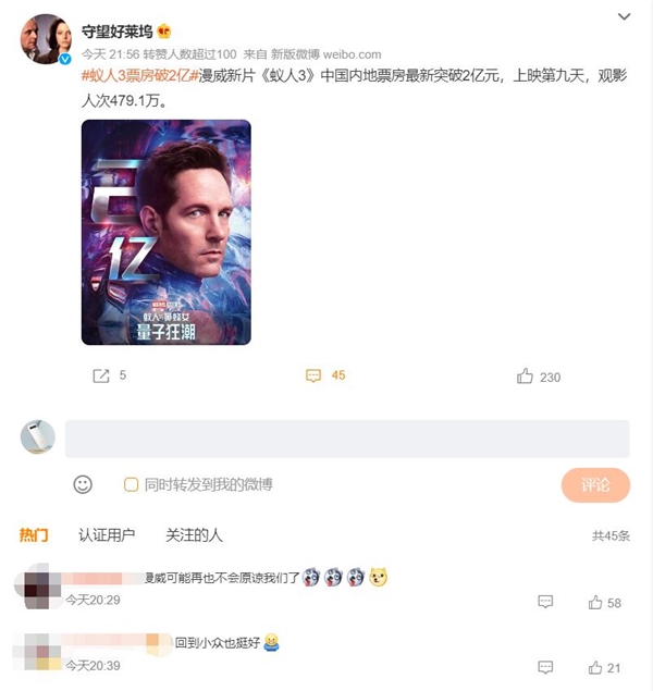 2月25日消息,猫眼专业版数据显示,漫威新片《蚁人3》上映第九天,中国内地票房突破2亿元,观影人次479.1万。 对此,有网友留言,回到小众也挺好。