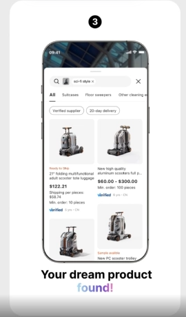 其中,图搜功能可同时根据用户上传图片和文字描述匹配到自己有需求的产品,“智能沟通”可通过 AI 对交流中的重要信息进行汇总,而升级的 RFQ 则可以帮助用户为目标产品一次性补充信息,或者匹配产品图片。