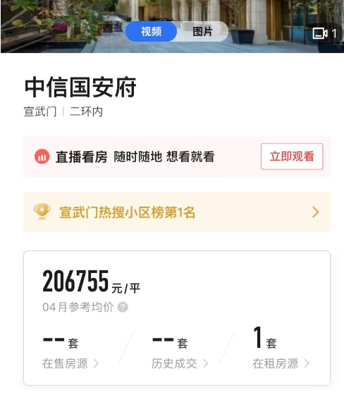 据界面新闻报道,这套抢手的二手房是复式楼房,位于中信国安府一期,单价高达25.5万元/平方米,而现时新房开盘均价为15万元左右。当时这套房是一期唯一在售的二手房源,周末仍有近50组客户看房,需验资2000万元。