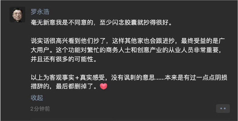 说实话很高兴看到他们抄了,这样其他家也会跟进抄,最终受益的是广大用户。这个功能对繁忙的商务人士和创意产业的从业人员非常重要,并且还有很多的可能性。