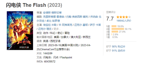 据了解,电影《闪电侠》于今年6月15日在中国内地上映,该片目前豆瓣评分为7.7分,超19万人给出评价,其中5星好评为19.6,4星评价占50.1%。