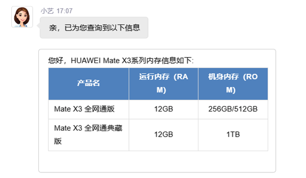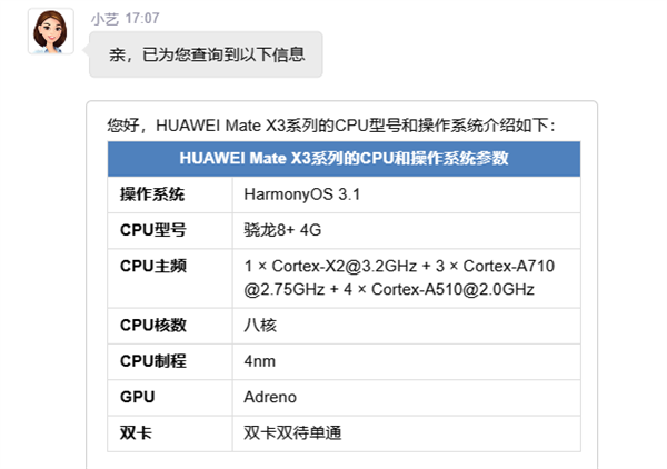 不过,目前Mate X3系列已经在官网上架,官方客服给出了详细的参数规格。