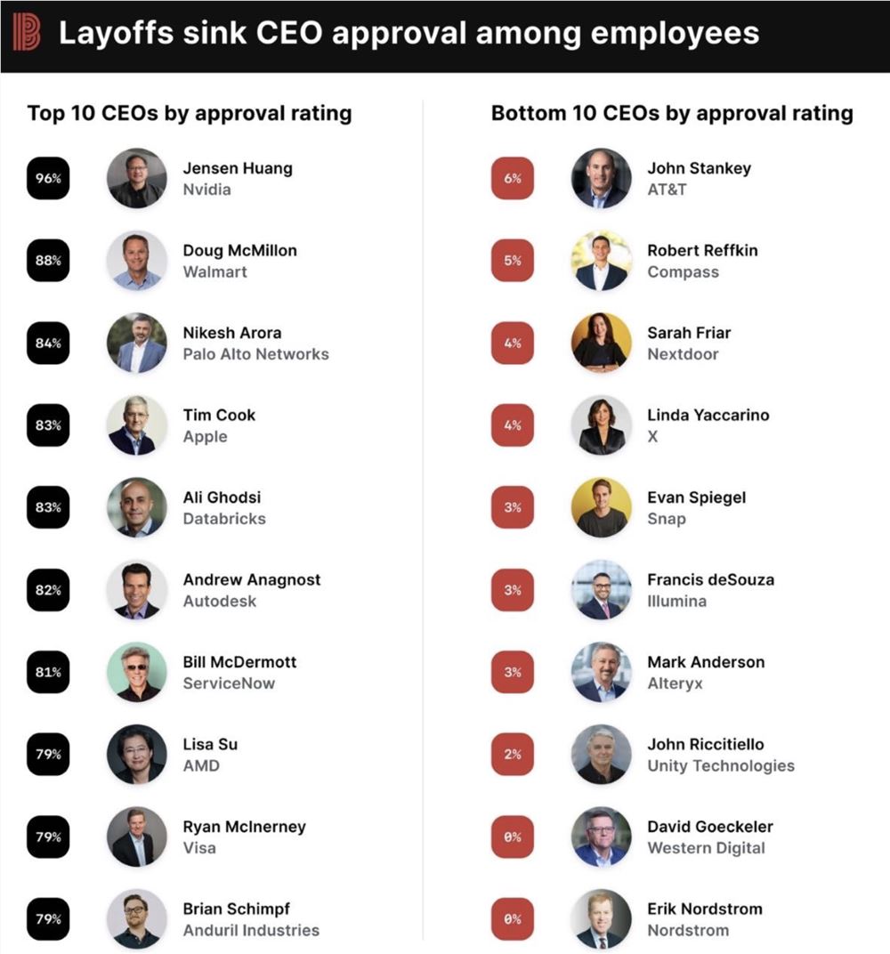 有最差的,就有最好的。英伟达凭借人工智能浪潮一飞冲天,市值突破1万亿美元,其CEO黄仁勋也得到了员工们的大力支持。Blind的2023CEO支持率指数显示,黄仁勋的支持率高达96%,是唯一一位突破90%的CEO。作为对比,今年CEO的平均支持率为32%。