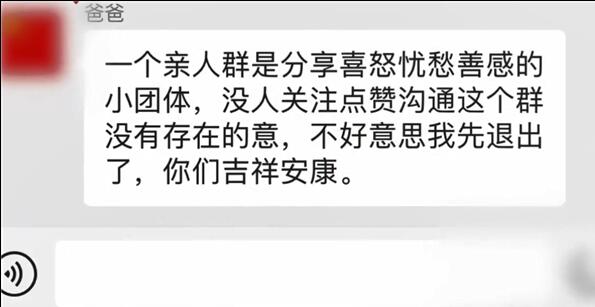 这位父亲说:“这个亲人群本来就是一个分享喜怒哀乐、感情交流的小团体,大家互相点赞,但是这个群没有任何存在意义,我想退出,祝你们平平安安。”
