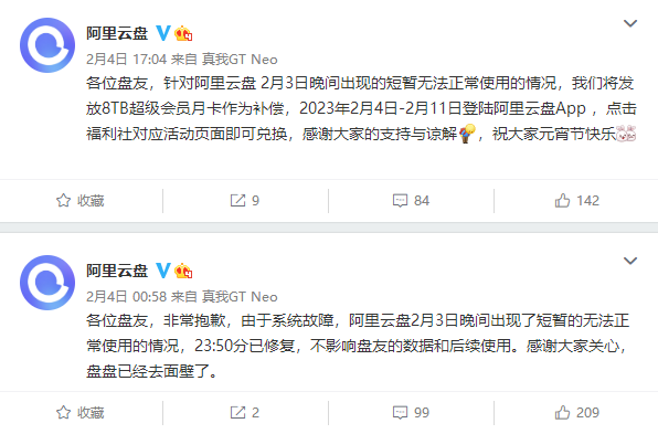 阿里云盘表示,针对2月3日晚间出现的短暂无法正常使用的情况,将发放8TB超级会员月卡作为补偿,2023年2月4日-2月11日登陆阿里云盘App,点击福利社对应活动页面即可兑换。