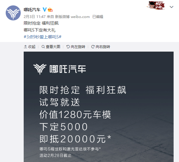 哪吒汽车宣布开启限时抢定活动,2月28日之前定金5000元可抵20000元车款,试驾还送价值1280元车模礼包。