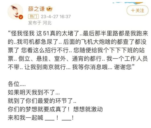 4月27日,歌手薛之谦突然成为热搜焦点。原因是他将在4月28日在南京举办演唱会,但五一假期机票实在太难抢购了,无法前往南京。因此,他在社交媒体上发布了一份请求,希望能够得到官方的帮助,无论是倒立、悬挂、户外或通宵火车站的票都可以,只要能够让他到达南京就行。