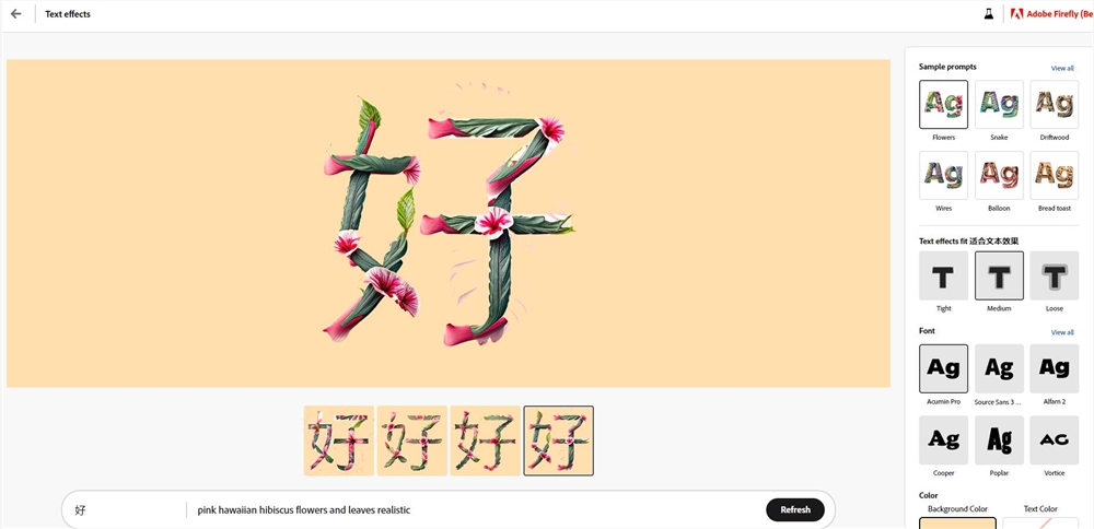 让人惊喜的是,Adobe Firefly 可以支持中文生成图像。不过中文不支持更换字体,只能用最基础的黑体进行生成,期待后期可以更新更多中文字体支持。