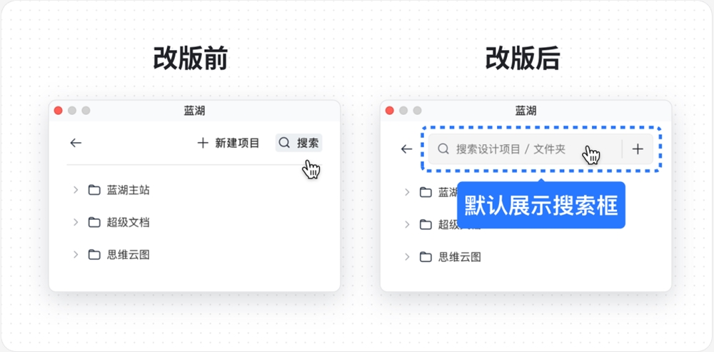 展示搜索框的表面,是节省了一步点击,但思考下来,用户真正诉求,是想更快地找到想要的搜索结果。「最近上传」模块,将最近上传的 5 个项目倒序展示,方便大家快速找到最近上传的项目,提有效率。