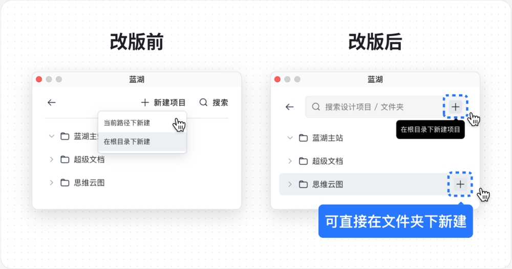 4、针对搜索结果,直接展示路径:还是基于「用户是想更快地找到想要的搜索结果」考虑,改版后增加了分类,「设计项目」和「文件夹」区分展示,并显示数量与路径,文件重名再也不怕啦!