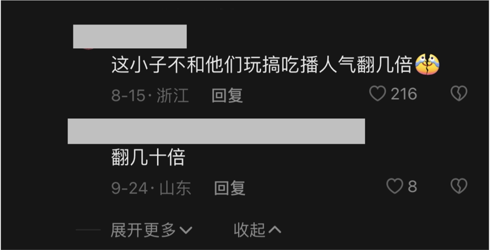 这一点也有一些用户留意到了,在评论区留言称:“这小子不和他们(ESO)玩,搞吃播人气翻几倍。”其他用户则跟评:“翻几十倍。”