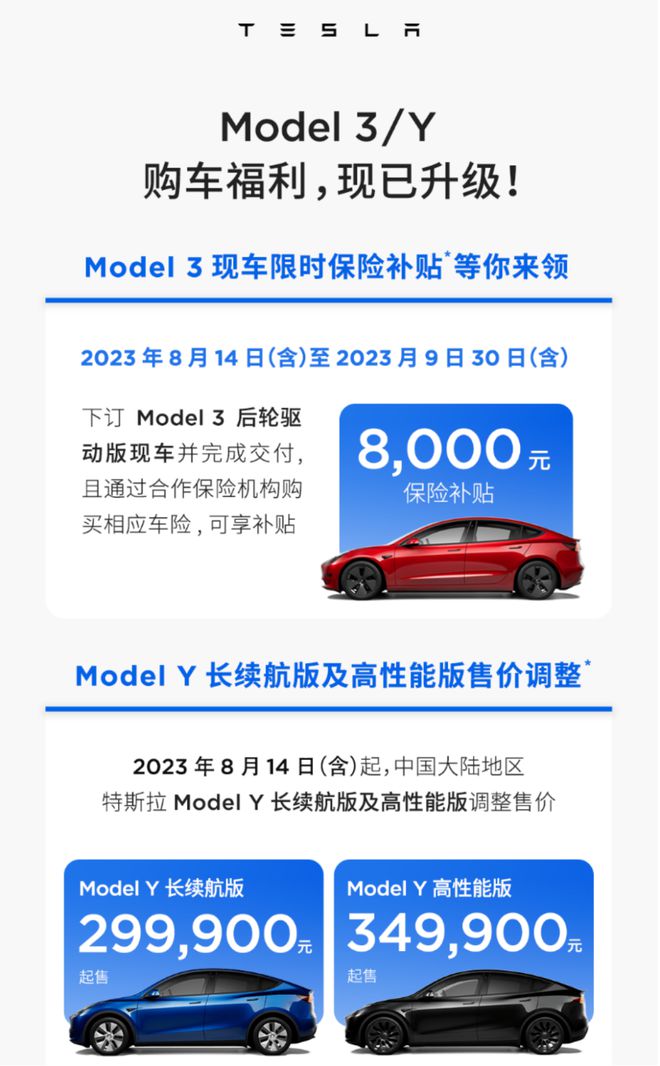 特斯拉在中国市场宣布降价措施,其中包括特斯拉 Model Y 长续航版和高性能版的售价下调1.4万元,起售价分别为29.99万元和34.99万元。此外,特斯拉还推出了 Model3的限时保险补贴,下订 Model3后轮驱动版现车并完成交付,通过合作保险机构购保险补贴可获得8000元补贴。
