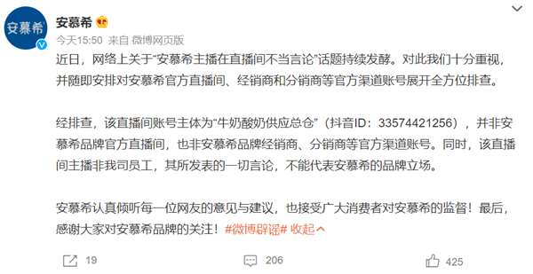 安慕希表示,近日,网络上关于安慕希主播在直播间不当言论”话题持续发酵。对此我们十分重视,并随即安排对安慕希官方直播间、经销商和分销商等官方渠道账号展开全方位排查。