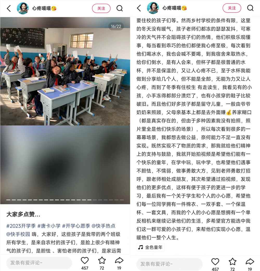 创作者“心疼喵喵”的心愿让人动容:作为一名乡村教师,她的学生大多是留守儿童,很多孩子家庭条件有限,每年冬天喝不上热水,经常小手冻烂。“心疼喵喵”想要帮助他们,但自己的力量总是薄弱的,不能照顾到每个孩子。
