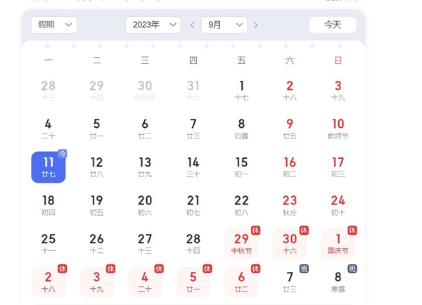 9月11日消息,据媒体报道,今年中秋节、国庆节假期,9月29日至10月6日连放8天,节前不调休。