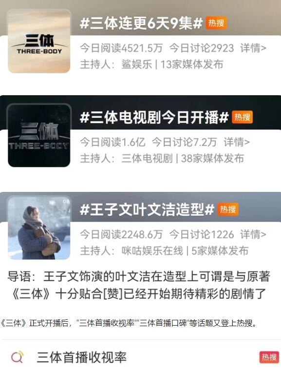1月15日21:30,电视剧《三体》在央视8频道和腾讯视频等平台首播,称之为“中国科幻的巅峰之作”的《三体》,一经公布就引发了广泛的关注,历经多年,终于与观众见面。19:30左右,小编发现,“三体”这个词条已经冲上微博热搜榜第二,讨论量超过120万,腾讯视频上关于这部剧的预约量也超过300万。