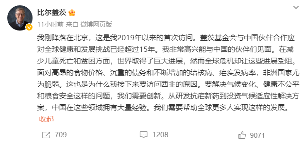 昨日晚间,微软公司创始人比尔盖茨宣布抵达北京,这是其2019年以来的首次访问。