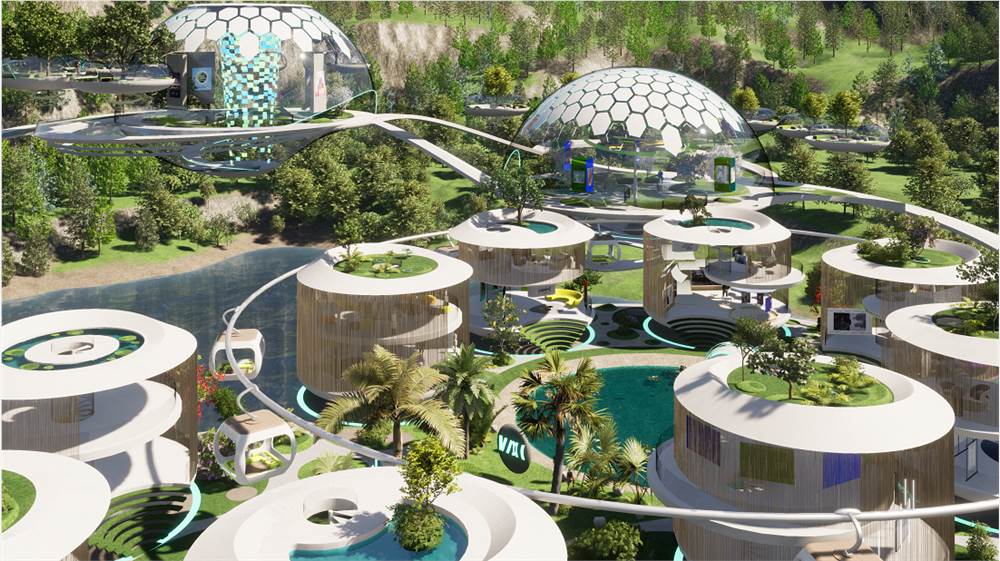 进入元宇宙展示区,1座被绿植与水元素环绕而成的虚拟空间屹立而起,2座半弧形建筑与6座圆柱形建筑依次陈列,在为各大内容共建方提供多元展示生态的同时,亦体现持续发展之理念,用户更可感受未来城市设计与人工智能技术加持的视觉震撼。