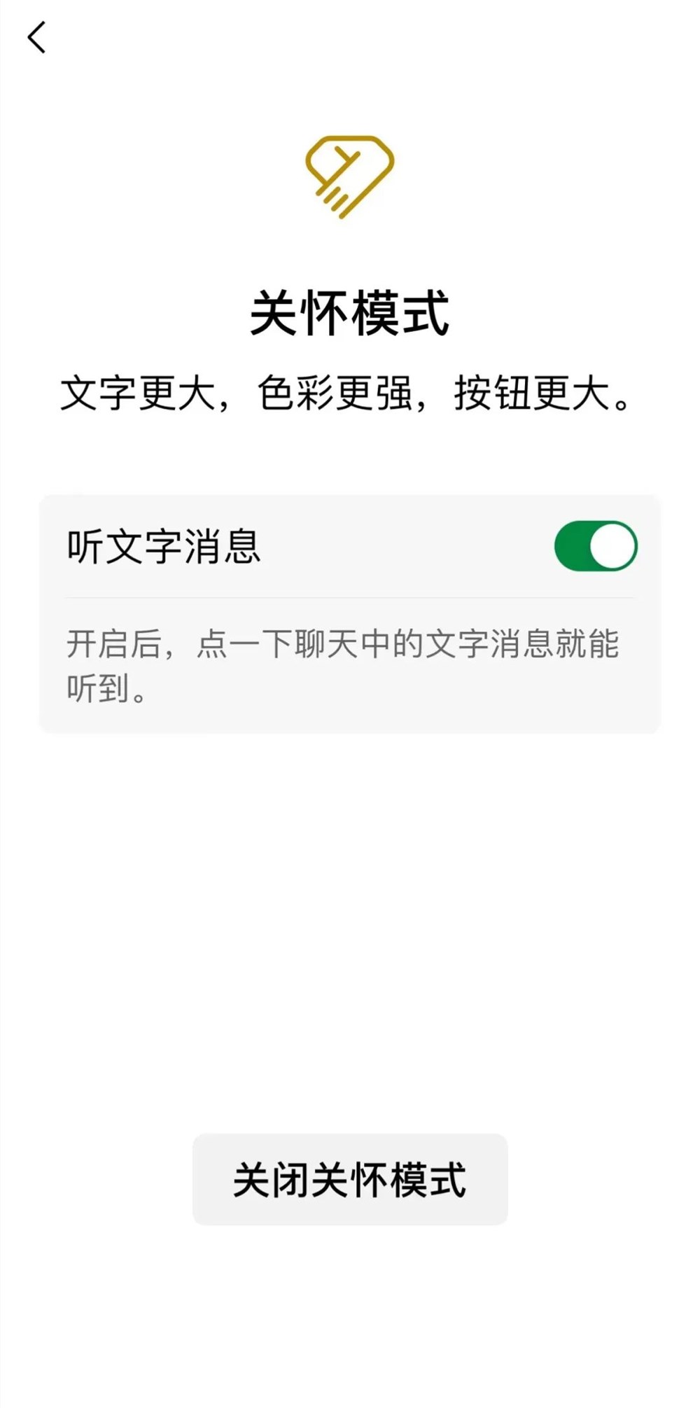 据介绍,针对不识字的老人,为了让这些用户也能平等地获取信息,微信基础产品团队联合微信AI团队,在“关怀模式”中推出了“听文字消息”功能,开启后,只需轻触“单聊”、“群聊”中的文字消息,就可听到朗读。