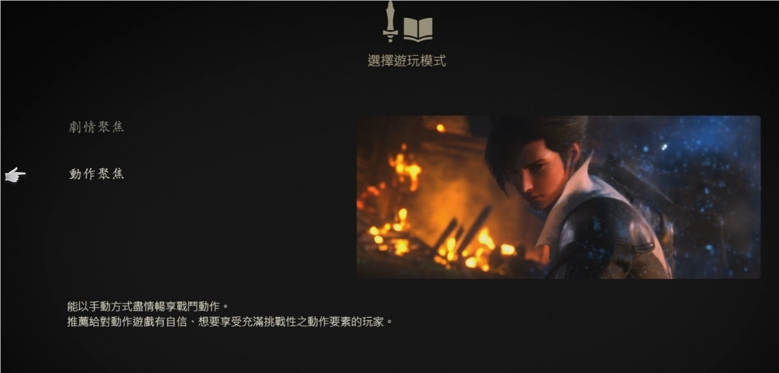 《最终幻想16》FF16最开始的设定中可以让玩家在「动作聚焦」和「剧情聚焦」两个模式之间选择,而这两个模式实质上是没有分别:不论动作聚焦还是剧情聚焦模式,其剧情、游戏流程和敌人强度均完全相同,唯一分别只是剧情聚焦中,游戏会预先帮玩家装备上各种「自动饰品」,大大减低战斗难度。