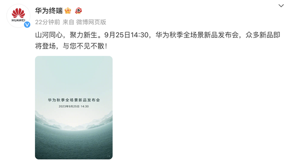 9月14日消息,据华为官方消息,华为今日宣布将于9月25日14:30举行秋季全场景新品发布会,众多新品即将登场。