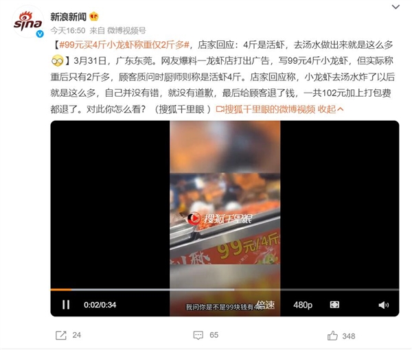 4月1日消息,据搜狐千里眼报道,有网友发布视频称,他在东莞某龙虾店购买龙虾,店家广告牌上明明写着99元4斤龙虾,结果回家一称却只有2斤。