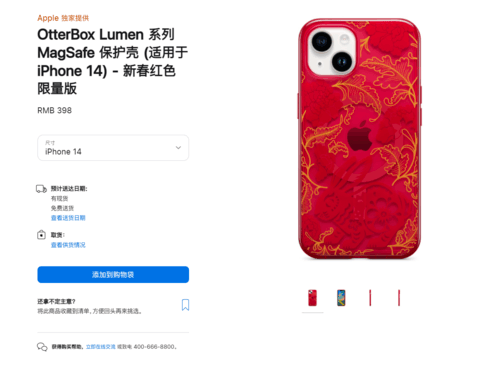 众所周知OtterBox是老牌数码产品保护壳厂家,常年为iPhone、iPad等苹果产品制作保护壳等周边配件,不管是苹果门店还是官方商城都可以看到OtterBox的产品。而就在近期,OtterBox专门为iPhone 14系列手机推出了新春红色限定版手机壳,上架苹果官方商城,且是独家专供,只在苹果官方门店及官方商城销售,定价和苹果官方普通硅胶保护壳一样398元。