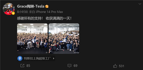 6月1日凌晨0时28分,特斯拉对外事务副总裁陶琳深夜通过微博发声,发布了两张照片,是马斯克与员工的大合影,配文表示感谢所有的支持! 收获满满的一天! ”,微博显示的地点也是上海超级工厂。
