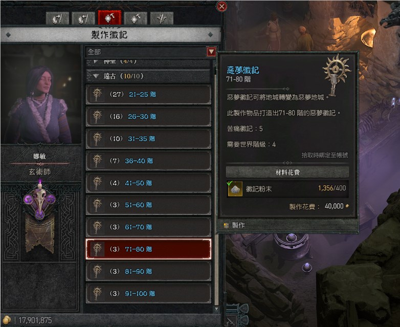 另外如果真的不小心把手头上最高等级的徽记给消耗掉了却没有打到更高等级的徽记,也可以去玄术师那边制作自己想打的徽记阶级,目前没有办法控制掉落或制作自己想打的地城,一切都是随机的,不过由于每一赛季只会挑选一百多个地城中的30个作为恶梦地城,因此玩家可以将相同地城的恶梦徽记累积几个后再一口气打掉,这样可以节省一些跑图的功夫。