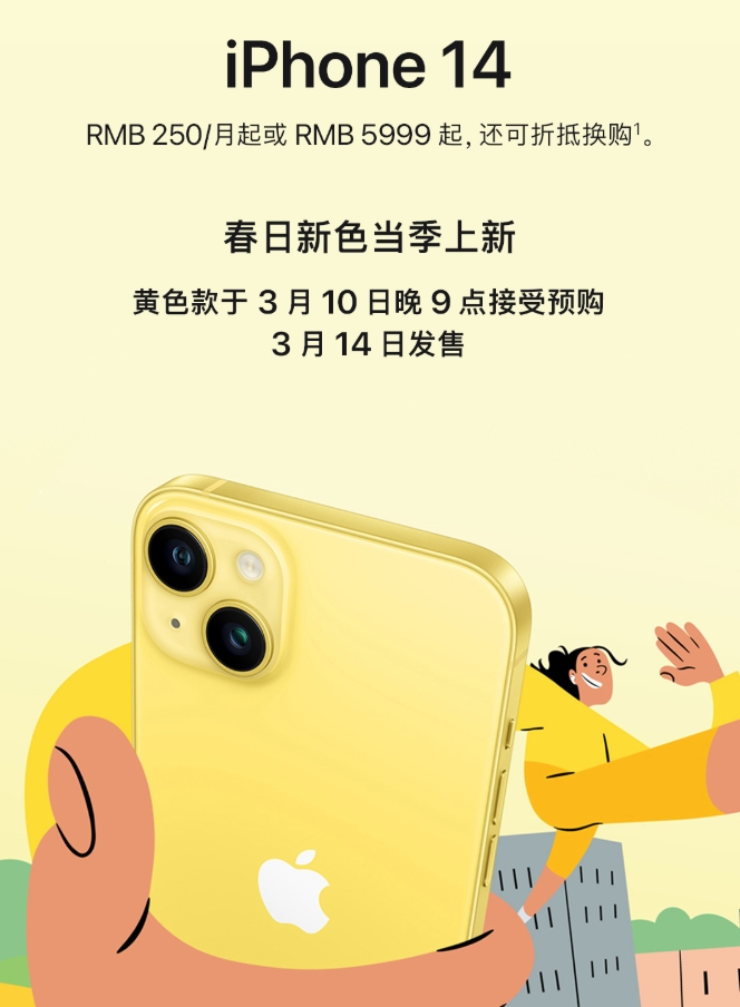 上述配色,于3月10日晚9点接受预购,3月14日发售。每位顾客限购6部黄色 iPhone14和6部黄色 iPhone14Plus,可享最长24个月免息分期服务。