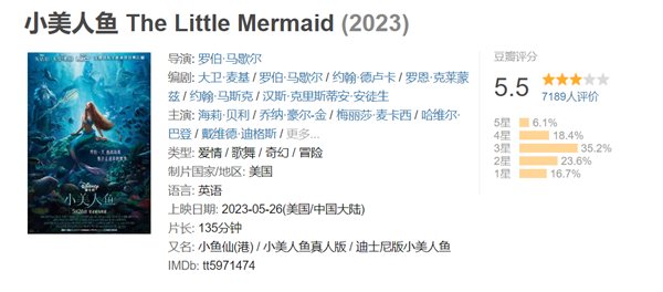迪士尼最新大作《小美人鱼》此前海外口碑失利,MC站均分60分,烂番茄新鲜度50%,现在国内的豆瓣也开分了,只有5.5分。