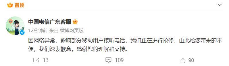 面对广东地区电信网络异常的情况,中国电信广东客服发表了声明回应。声明中表示:“受网络异常的影响,部分移动用户无法接听电话。我们正在积极抢修,为此给您带来的不便,我们深表歉意,感谢您的理解和支持。”
