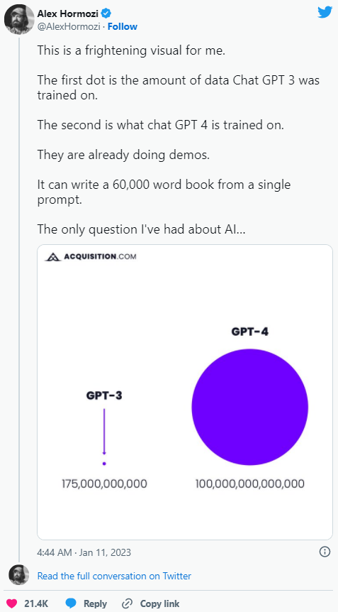 一位人工智能爱好者估计,GPT-4预计用100万亿个参数进行训练,不过OpenAI首席执行官萨姆·奥特曼后来称这个数字“完全是胡扯”。