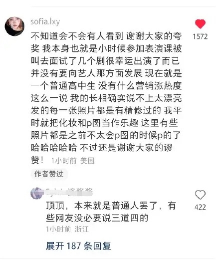 她强调自己经营一些社交媒体账号只是喜欢分享,现在主要任务就是好好学习,谢谢大家的喜欢”。她还表示,自己没有买热搜也没有买营销号。