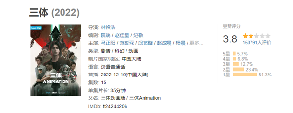 在豆瓣上,《三体》动画仅获得了3.8分的成绩,超过15万的评分中,有51.3%的观众给出了一星差评。