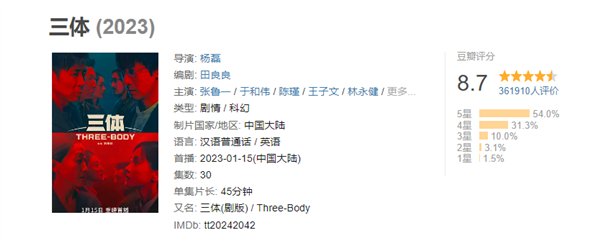 而反观几乎同期开播的《三体》电视剧,虽然有所改编,但关键剧情几乎是1:1复刻还原了原著内容,并且特效制作和演员都不断给剧集加分,在完结之后豆瓣分数还在上涨,目前已经达到了8.7分,评分人数超过36万,有54%的五星好评。