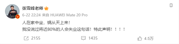 6月22日晚,张雪峰发布微博称:人在家中坐,锅从天上来!我没说过将近80%的人会失业这句话!特此声明!!!!”