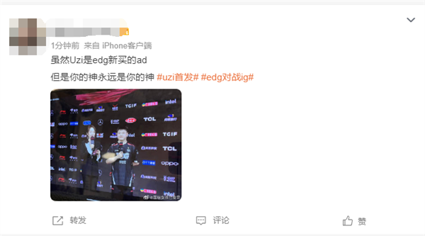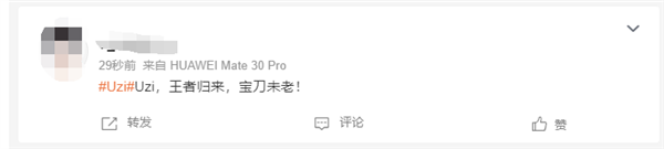 不少网友在微博发文祝贺Uzi称:Uzi YYDS”Uzi,王者归来,宝刀未老”虽然Uzi是EDG新买的Ad,但是你的神永远是你的神”。