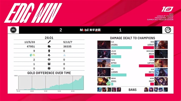 经过24分钟的对局,EDG轻松战胜IG,拿下今天比赛的胜利。