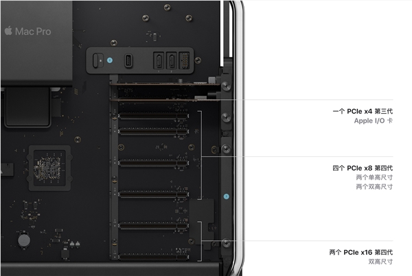 据苹果介绍,这7个PCIe插槽中6个是PCIe4.0,可用于扩展音频、视频I/O、网络功能和存储,还有一个PCIe3.0x4被苹果I/O卡预装占用。