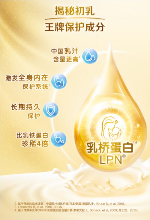 婴幼儿时期的小宝宝大多是以奶粉为主食的,所以奶粉的选择也很重要,要选择含有保护力成分的奶粉。乳桥蛋白LPN,它是天然乳源OPN乳汁中的保护活性成分,因为天然所以非常亲和;能够帮宝宝断奶不断保护力。而且它非常珍贵,比很火的乳铁蛋白还少有 4 倍。 5 万公斤牛乳只有 1 公斤乳桥蛋白,妥妥的“贵族”成分。乳桥蛋白LPN很特别,像一把保护力钥匙,能激发宝宝自己的保护系统,带来双向保护:对内加强自身保护力,体质好了,还抵御外在伤害,身体更强壮。乳桥蛋白这么珍贵的营养,合生元派星一罐就有 6 倍含量,达临床水平高标准。