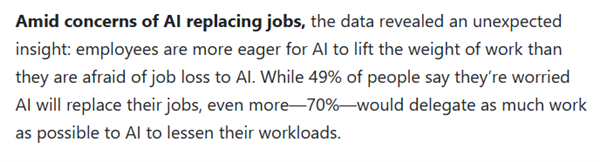 这反映出一个有趣的事实即便是担心自己工作会被AI取代的员工,也并非全部都抵触AI,他们中依旧有一部分认为AI的加入将能够让自己从庞杂的工作中解放出来。