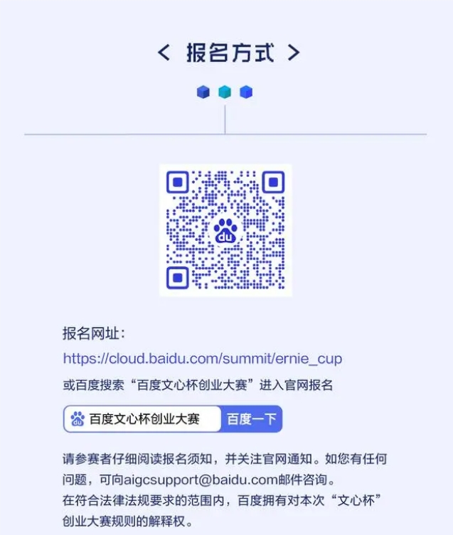 据介绍,本次创业大赛于5月31日正式启动,报名持续到6月25日24:00关闭。按要求,参赛团队需专注于AIGC、大模型创新应用方向,有意愿且有能力基于文心大模型搭建应用,或将文心大模型与自有产品进行结合。无论是有创业计划的初创团队,还是有成型产品或demo的初创公司,均可参赛。