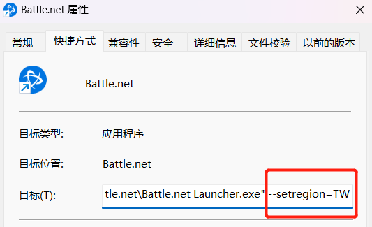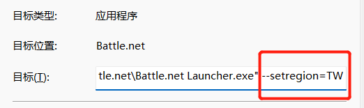 3、接着你就可以看到你战网的属性了,在目标这一栏,后面加一句--setregion=TW。