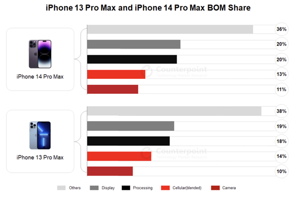 Counterpoint研究显示,128GB版本iPhone 14 Pro Max的混合物料清单(BoM)成本约为464美元(约合3180元),较iPhone 13 Pro Max增加3.7%。